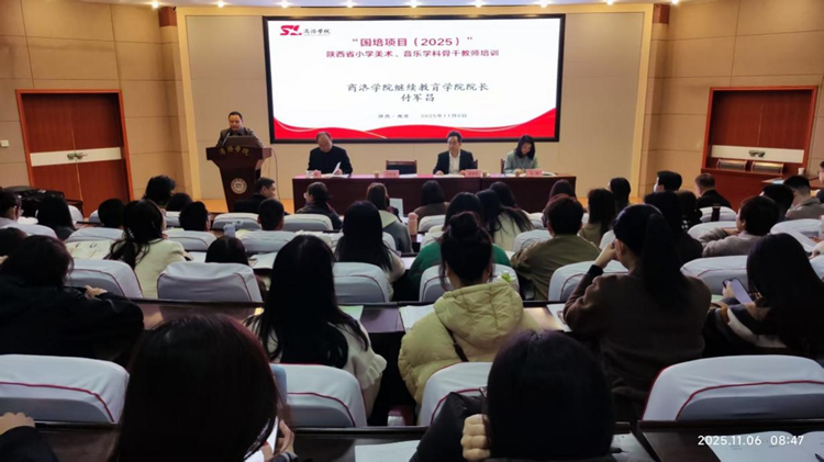 11 月 6 日 上午,由省教育廳主辦,我校繼續(xù)教育學院承辦的“國培項目(2025)” 陜西省農(nóng)村小學美術(shù)、音樂學科骨干教師培訓班開班典禮在我校舉行。繼續(xù)教育學院付軍昌、藝術(shù)學院院長唐曌堃、藝術(shù)學院首席專家張婷及來自全省100余名骨干教師參加活動。