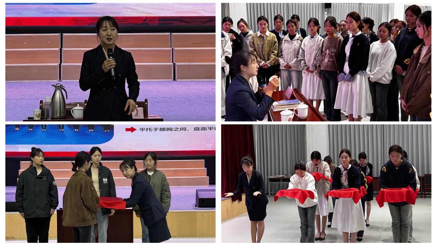 此次培訓緊扣會議服務(wù)實戰(zhàn)需求,聚焦“會議服務(wù)中的崗位形象”“會議服務(wù)中的接待禮儀”與“會議服務(wù)中的頒獎流程”三大核心模塊。烏夢媛老師通過理論講解、案例分析與現(xiàn)場示范相結(jié)合的方式,為隊員們帶來了生動的一課。在崗位形象部分,她細致闡述了儀容、儀表、儀態(tài)的規(guī)范要點;在接待禮儀環(huán)節(jié),結(jié)合真實場景,講解了流程把控、溝通技巧與標準引導手勢;在頒獎流程演練中,就隊員的站位、動作節(jié)奏及面部表情等細節(jié)進行了精準指導。