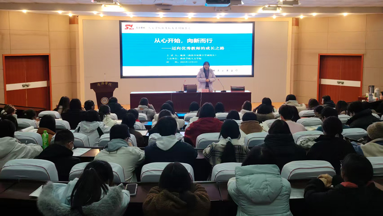 為幫助師范生明晰職業(yè)方向、夯實(shí)專業(yè)基礎(chǔ),12月1日,人文學(xué)院邀請(qǐng)96級(jí)英語(yǔ)教育專業(yè)優(yōu)秀校友、商洛市初級(jí)中學(xué)副校長(zhǎng)喻莉作了題為“從心開始,向新而行——邁向優(yōu)秀教師的成長(zhǎng)之路”的報(bào)告。英語(yǔ)專業(yè)、漢語(yǔ)言文學(xué)專業(yè)150余名學(xué)生參加了報(bào)告會(huì)。報(bào)告會(huì)由院黨委書記劉麥霞主持。