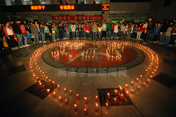 4月22日晚。我校學(xué)生自發(fā)組織祈?;顒樱瑸椤?·20”雅安地震中遇難的同胞默哀,為災(zāi)區(qū)人民祈福