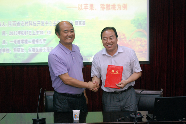 6月7日上午,我校舉行兼職教授受聘儀式,陜西省科技廳農(nóng)村科技開(kāi)發(fā)中心主任雷玉山研究員受聘為我校兼職教授,副院長(zhǎng)劉建林為雷玉山頒發(fā)了聘書。雷玉山還為我校生物醫(yī)藥工程系師生作了題為《農(nóng)產(chǎn)品質(zhì)量安全問(wèn)題與對(duì)策》的專題報(bào)告,并向我校捐贈(zèng)了多部個(gè)人著作